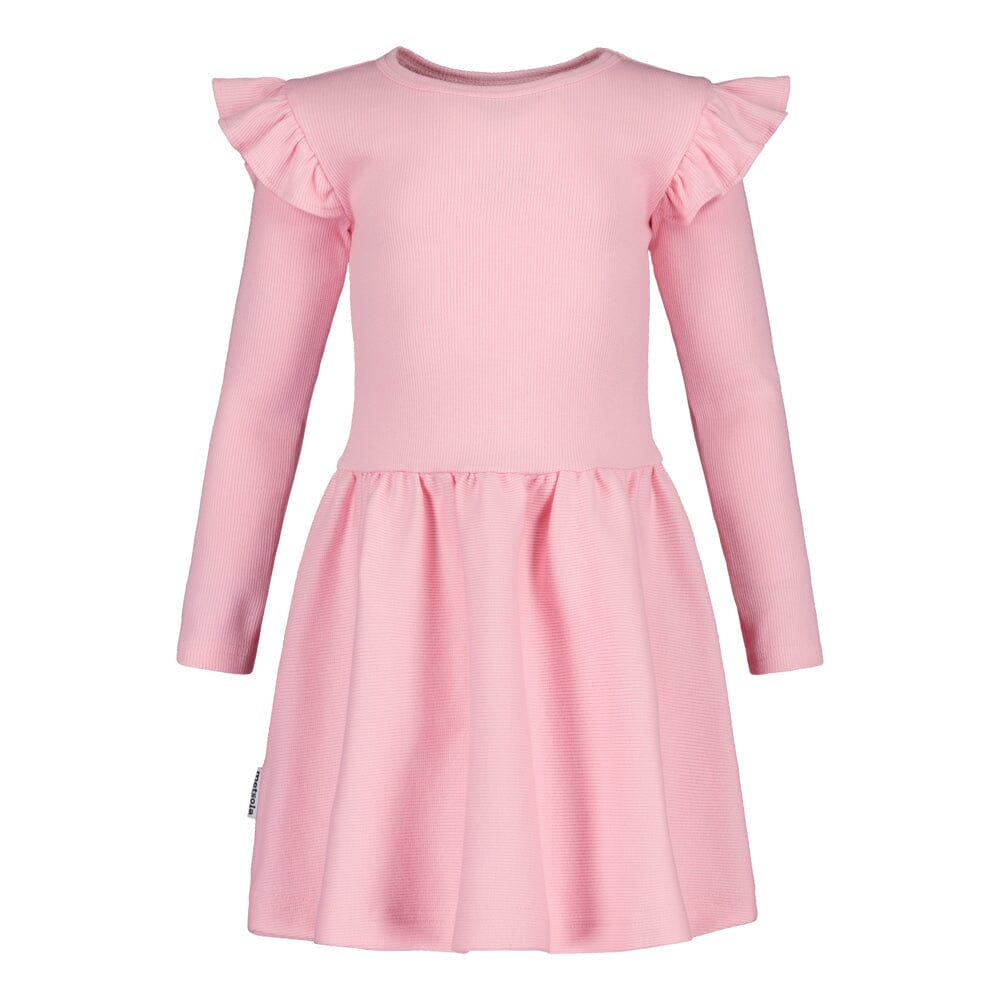 The Rib Frilla dress in pinkie is a lovely long-sleeved dress for children that combines a playful look with everyday practicality. The fresh pink Pinkie shade brings a fresh pop of color and joy to the outfit.