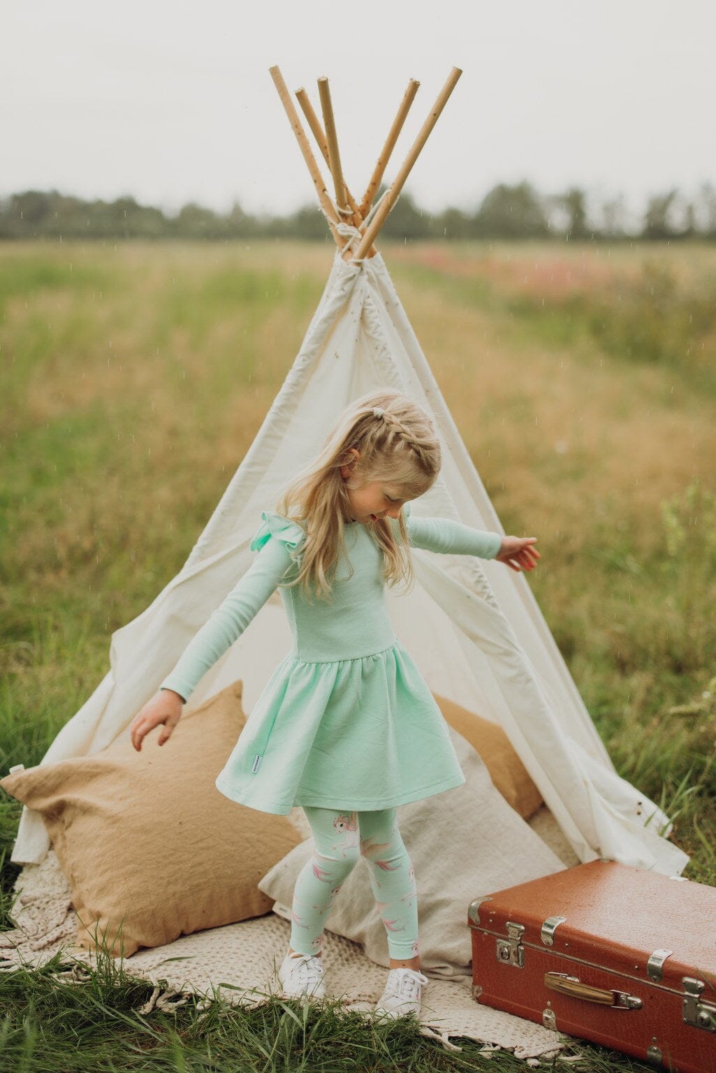 The girl in the picture is 106cm tall and is wearing size 98/104. The measurements in the size chart are approximate. The measurements are +/- 1cm accurate.