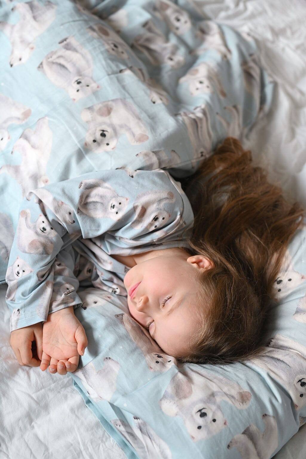 Polar Bears Duvet Cover Set Baby Size, Icy Blue is a soothing and beautifully cool bedding set for baby. The polar bear pattern designed by Henna Adel brings a winter fairy tale world to life, where little bear cubs frolic. Icy Blue is a sophisticated light blue shade that brings a serene atmosphere to the bedroom.