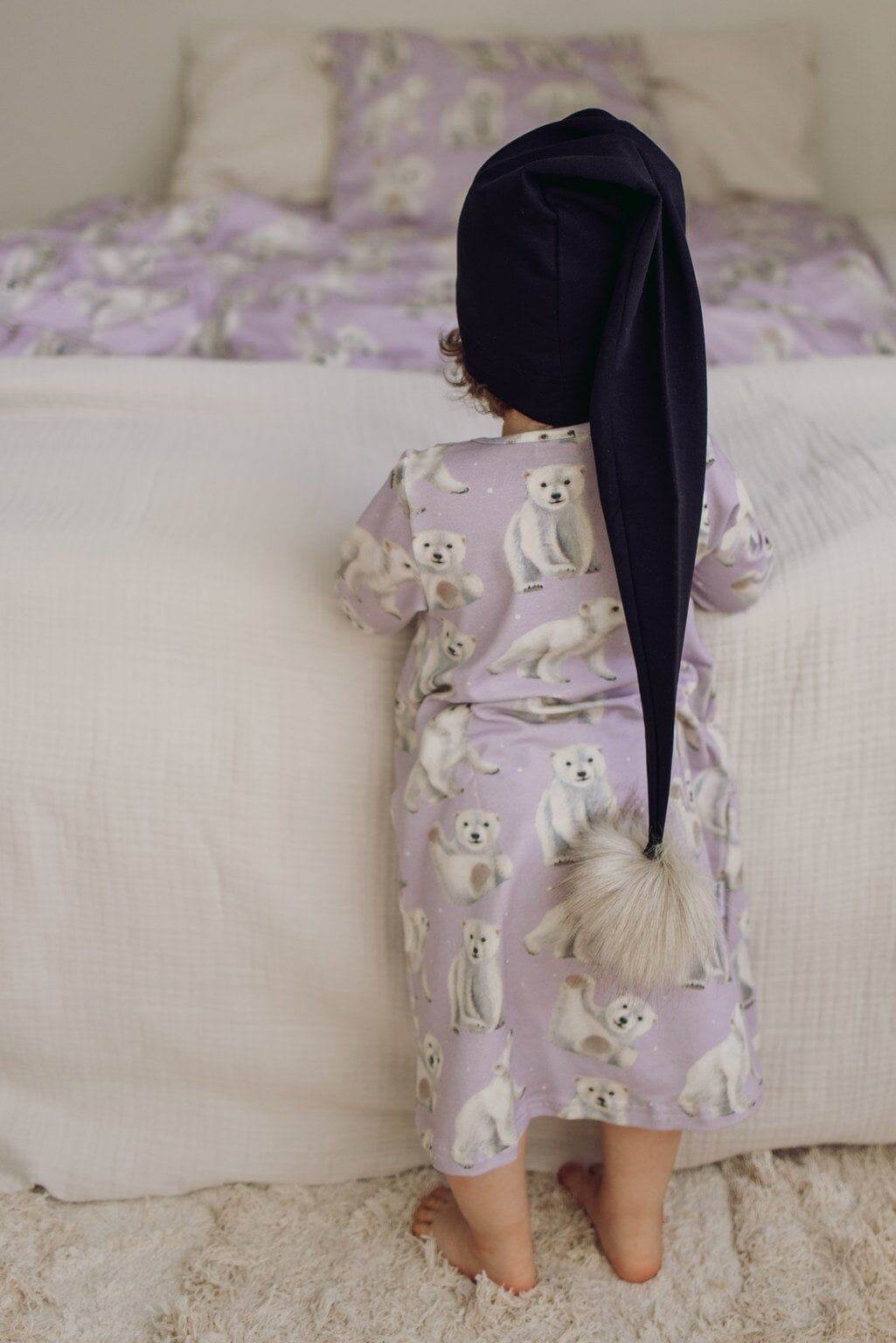 The Polar Bears Nightdress in Icy Lilac is like a dream winter dress - soft, beautiful and full of fairy tales. Designed by Henna Adel, the pattern features cute polar bears playing in a dreamy landscape, whose soft lilac Icy Lilac base makes this nightdress soothing and visually charming. The children's nightdress is part of Metsola's atmospheric Under the Same Moon collection.