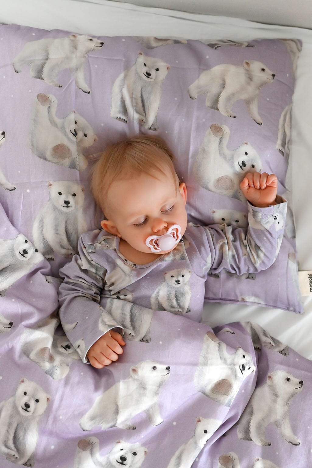 Polar Bears Pajamas in Icy Lilac invite little dreamers to a fairytale winter night. Made from soft organic cotton, these pajamas feature adorable polar bear cubs in a pattern created by Henna Adel that exudes peace and playfulness.