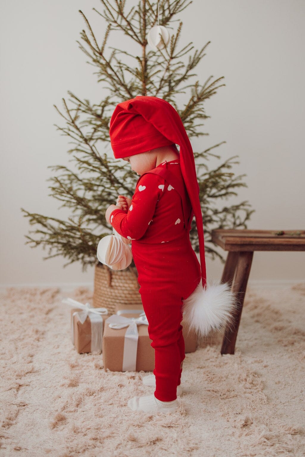 In this baby bodysuit, you can truly see and feel the heart of Metsola! ❤︎ The long-sleeve bodysuit is crafted from super-soft and stretchy organic cotton rib fabric. Snap buttons on the shoulders and crotch make dressing effortless. The beautiful print and perfect red shade bring a touch of charm to both everyday moments and celebrations for the littlest family members this winter season.