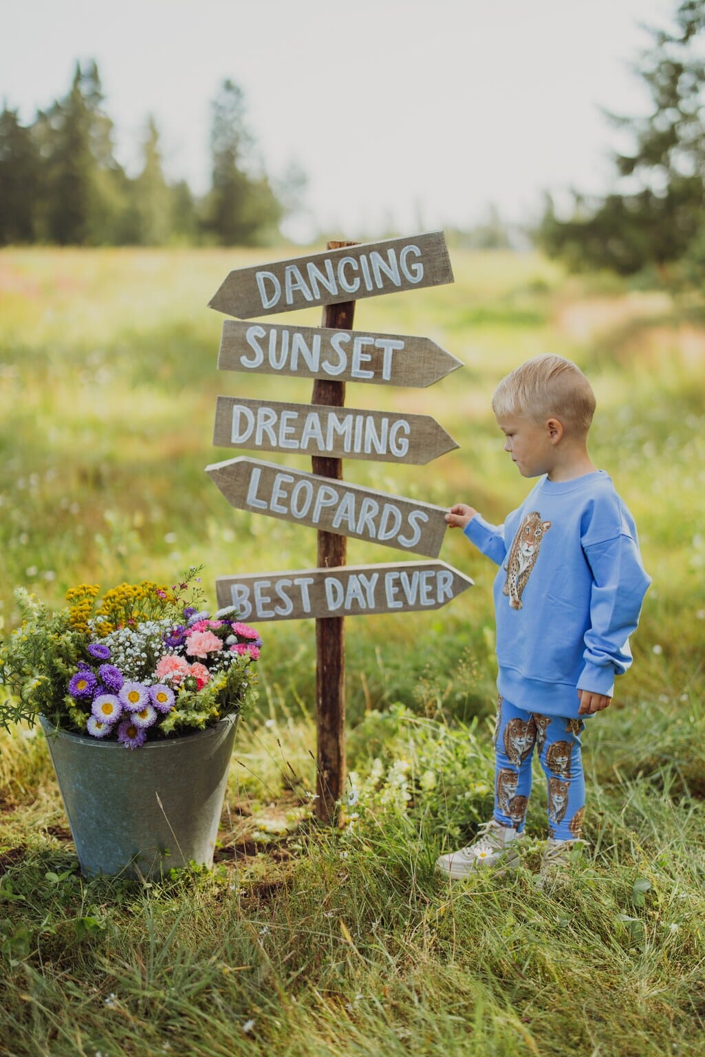 The boy in the picture is 98cm tall and is wearing size 98/104. The measurements in the size chart are approximate. The measurements are +/- 1cm accurate.