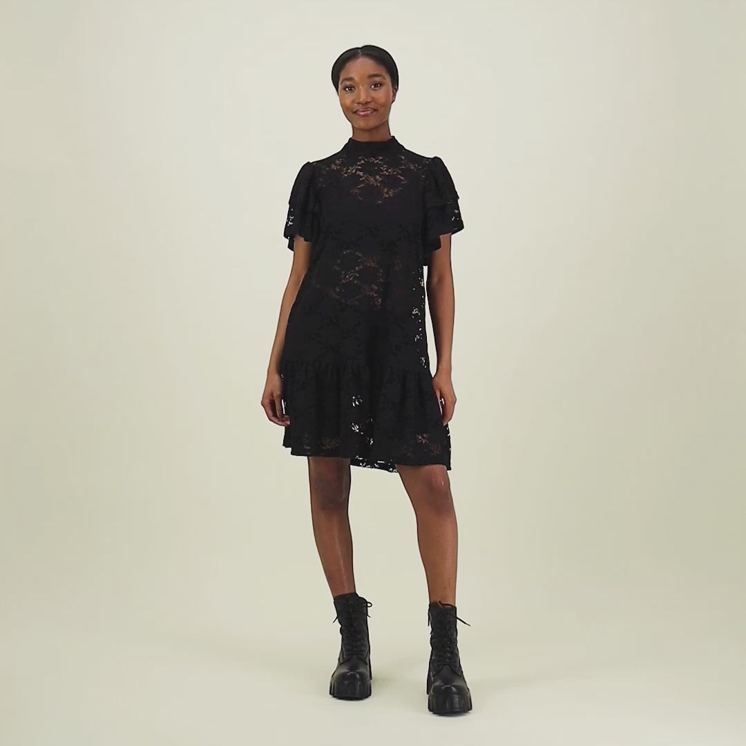 The dress is made of translucent lace and does not have a petticoat. Wear it with biker shorts, a thin petticoat or play with contrasts - layering is part of the nature of this dress. The short hem and layered sleeves make the whole thing light and expressive, while the high collar balances the silhouette, bringing a touch of classicism.