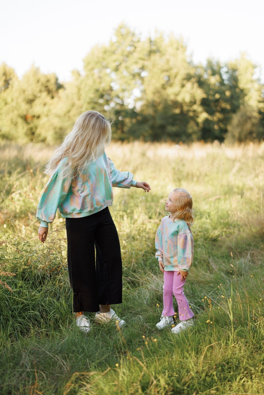 These wide-leg leggings come in practical double sizes, which extend their lifespan and allow the garment to last longer as your child grows. The waistband has a comfortable elastic band that keeps the leggings in place without feeling tight.