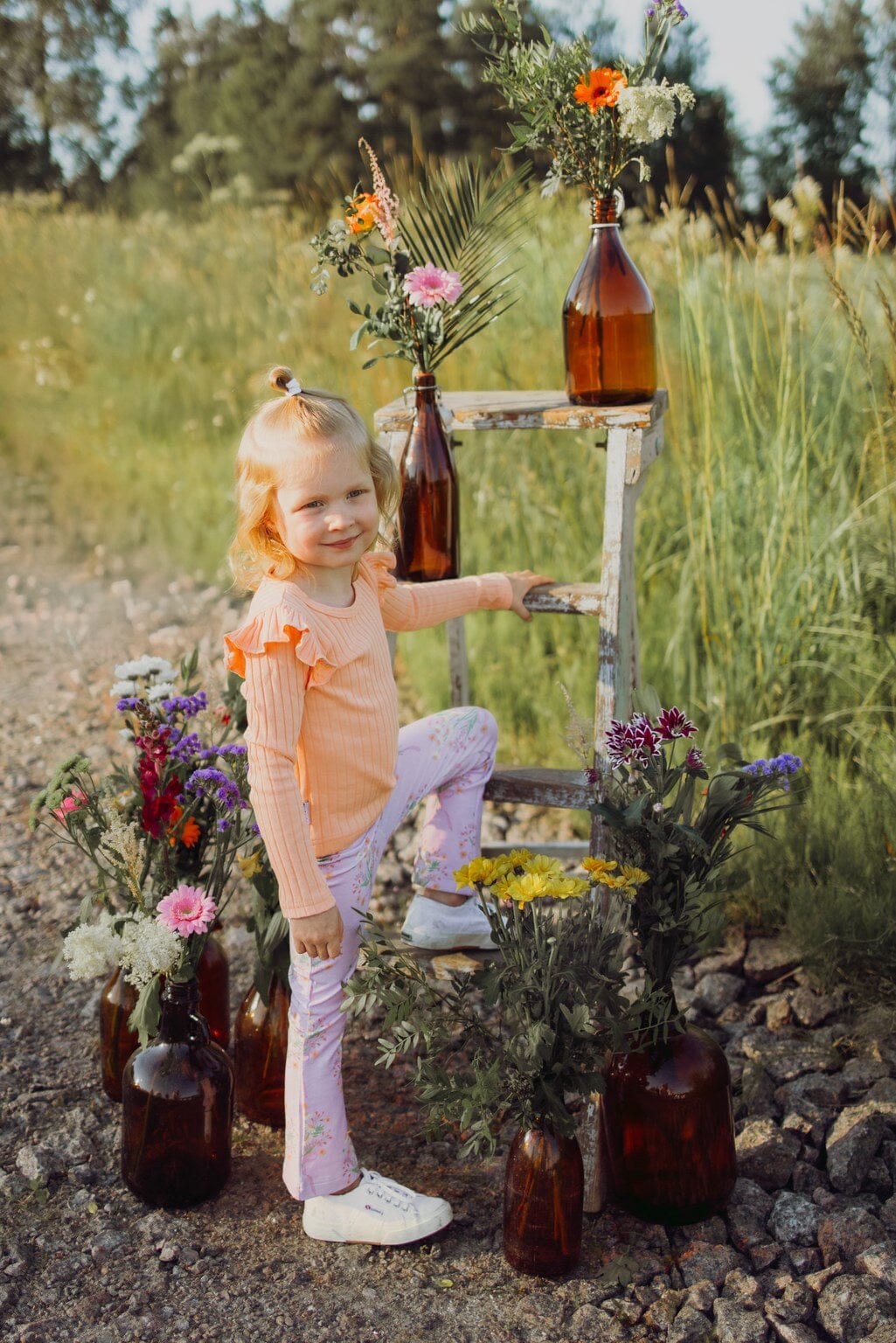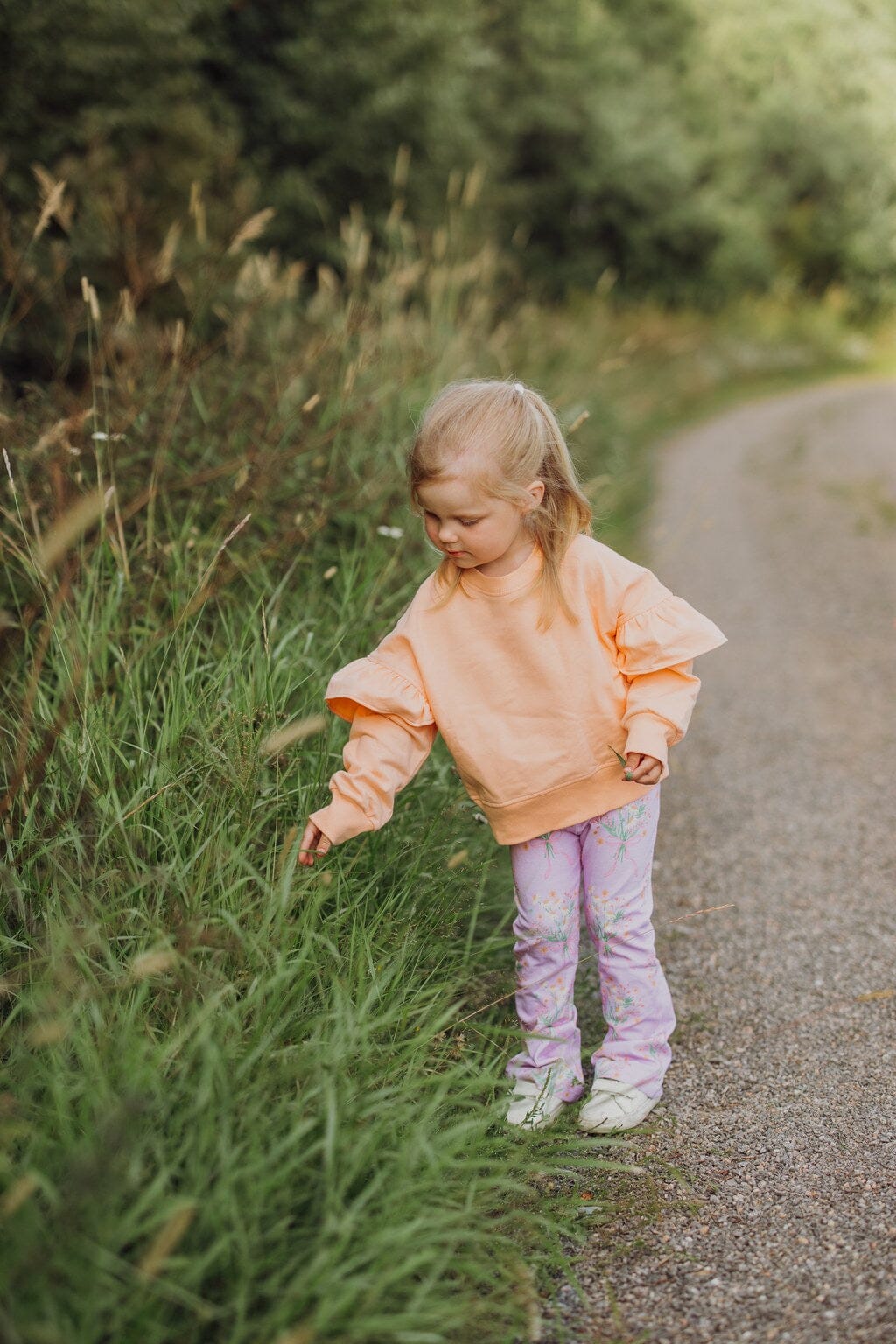 The pants' legs flare slightly downwards, creating a relaxed and playful silhouette. The material is organic cotton jersey, which is soft, stretchy and comfortable to wear - designed for play, movement and use.