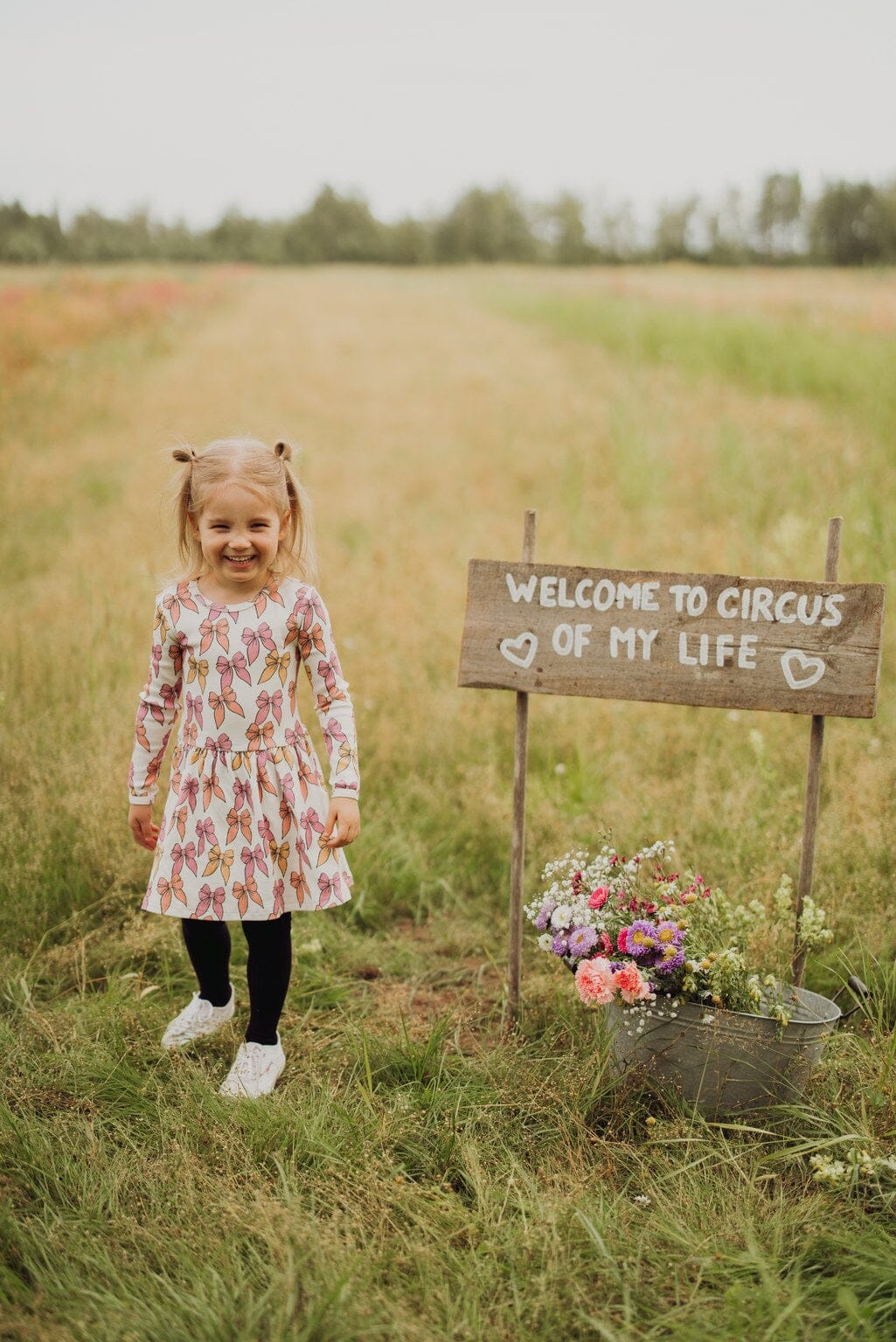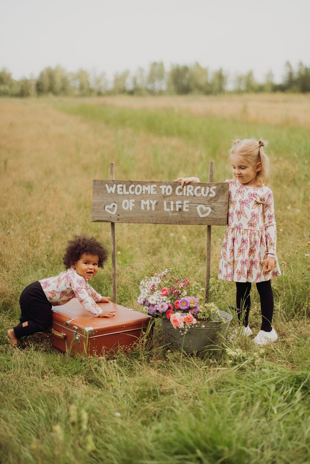 The girl in the picture is 103cm tall and is wearing size 98/104. The measurements in the size chart are approximate. The measurements are +/- 1cm accurate.