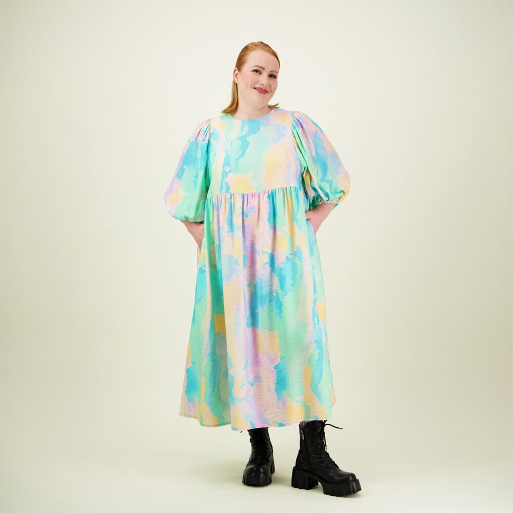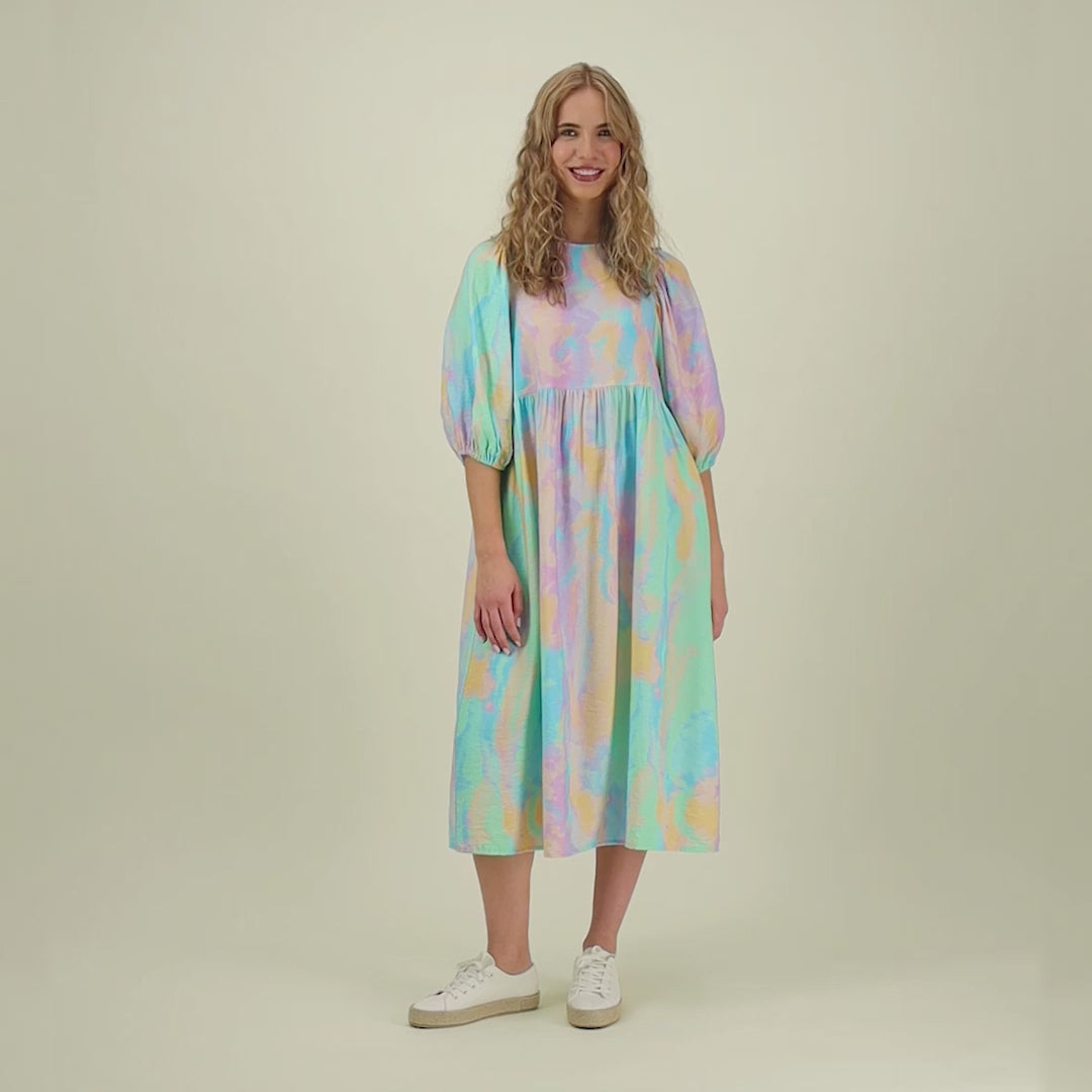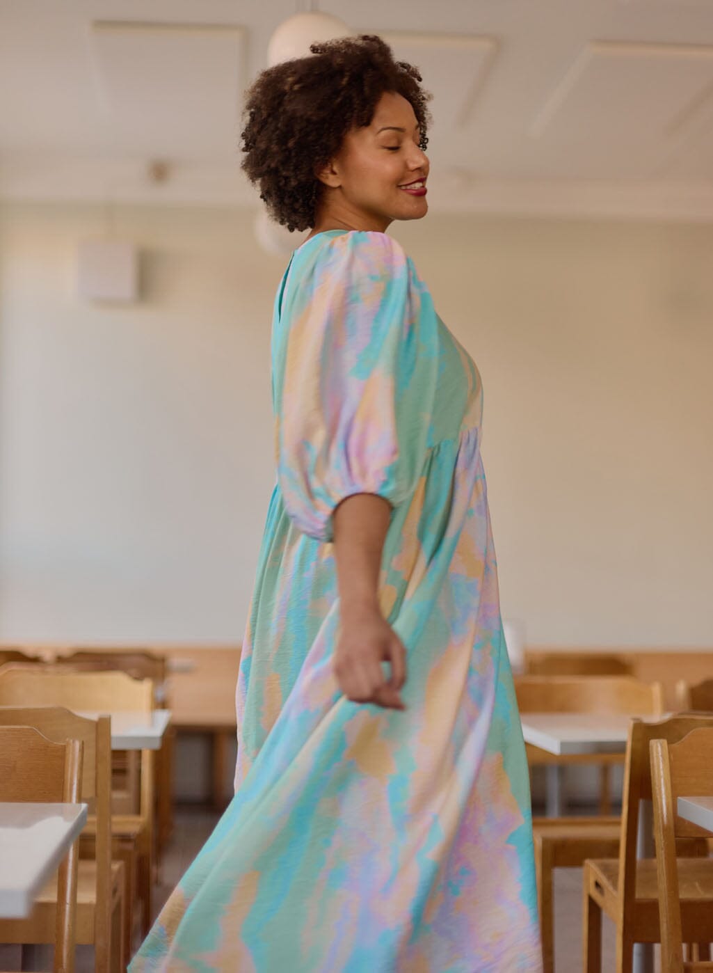 The Sunset Puff Sleeve Midi Dress is an eye-catcher that combines a feminine shape, artistic pattern and carefree comfort. The dress is made of lightweight viscose that flows beautifully and gives you room to move. The half-length puff sleeves add volume to the look, and the midi length makes the dress suitable for both everyday and festive occasions.