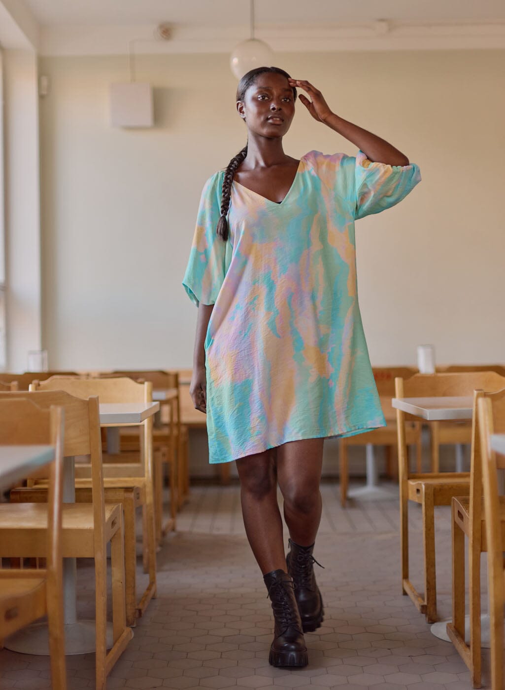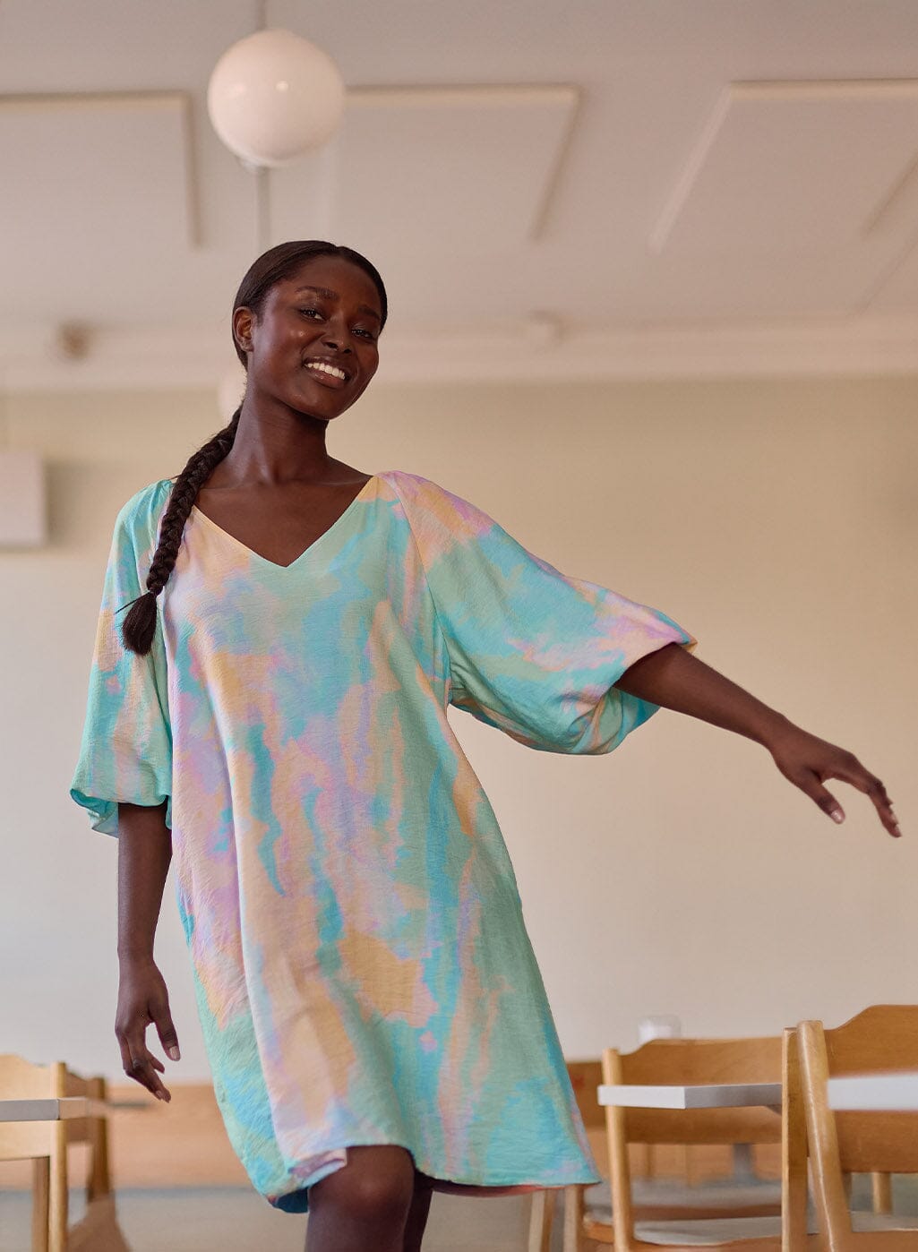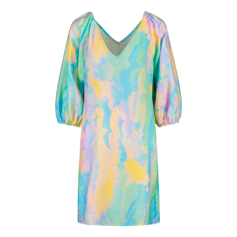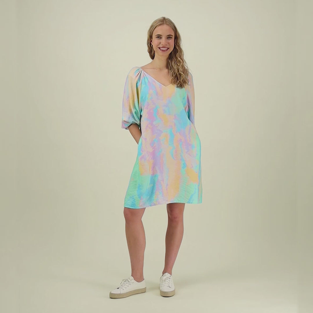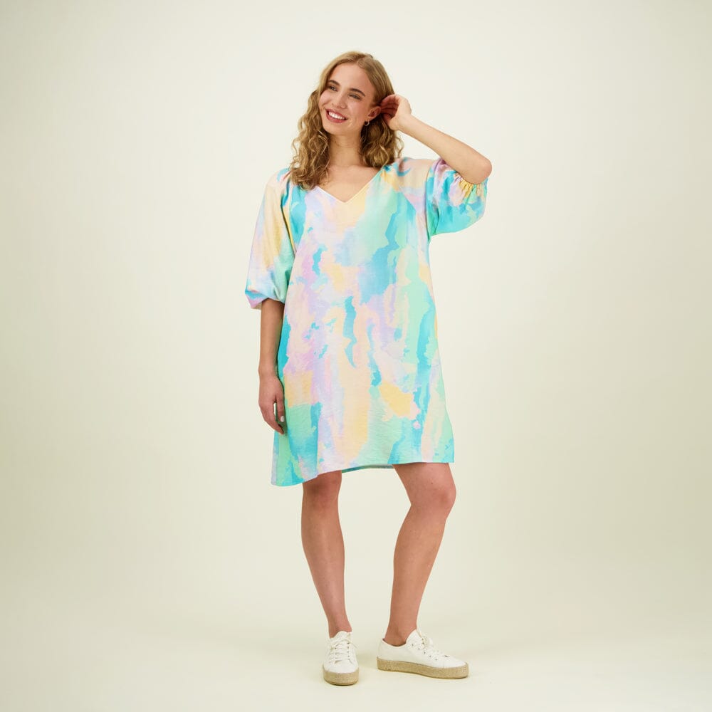 The Sunset Volume Sleeve Tunic Dress is a flowing tunic dress that combines ease of use with an artistic look. The dress is adorned with the stunning Sunset pattern from the More Love collection, an abstract painting by Iris Maschek, whose soft pastel tones exude sensitivity and boldness.